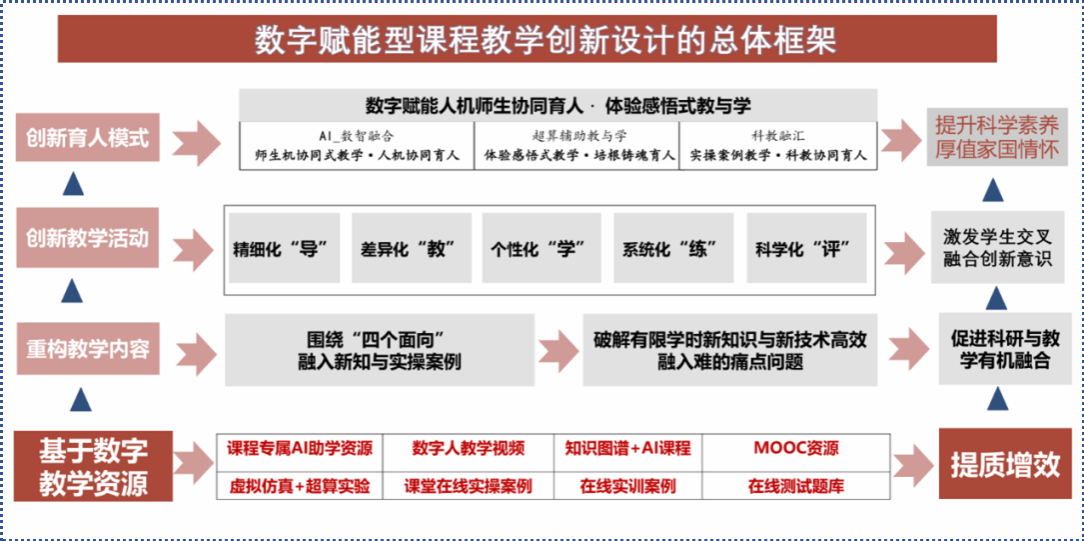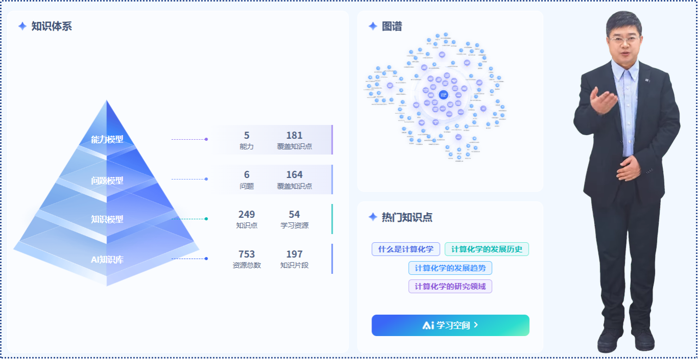基于国内开源大模型和AI平台,建设数字人教学视频、知识图谱和AI学伴,同时结合课程慕课、课堂在线实操案例、在线测试题库、虚拟仿真、超算实验等多样化教学资源,进行了数字赋能型课程的教学创新设计。